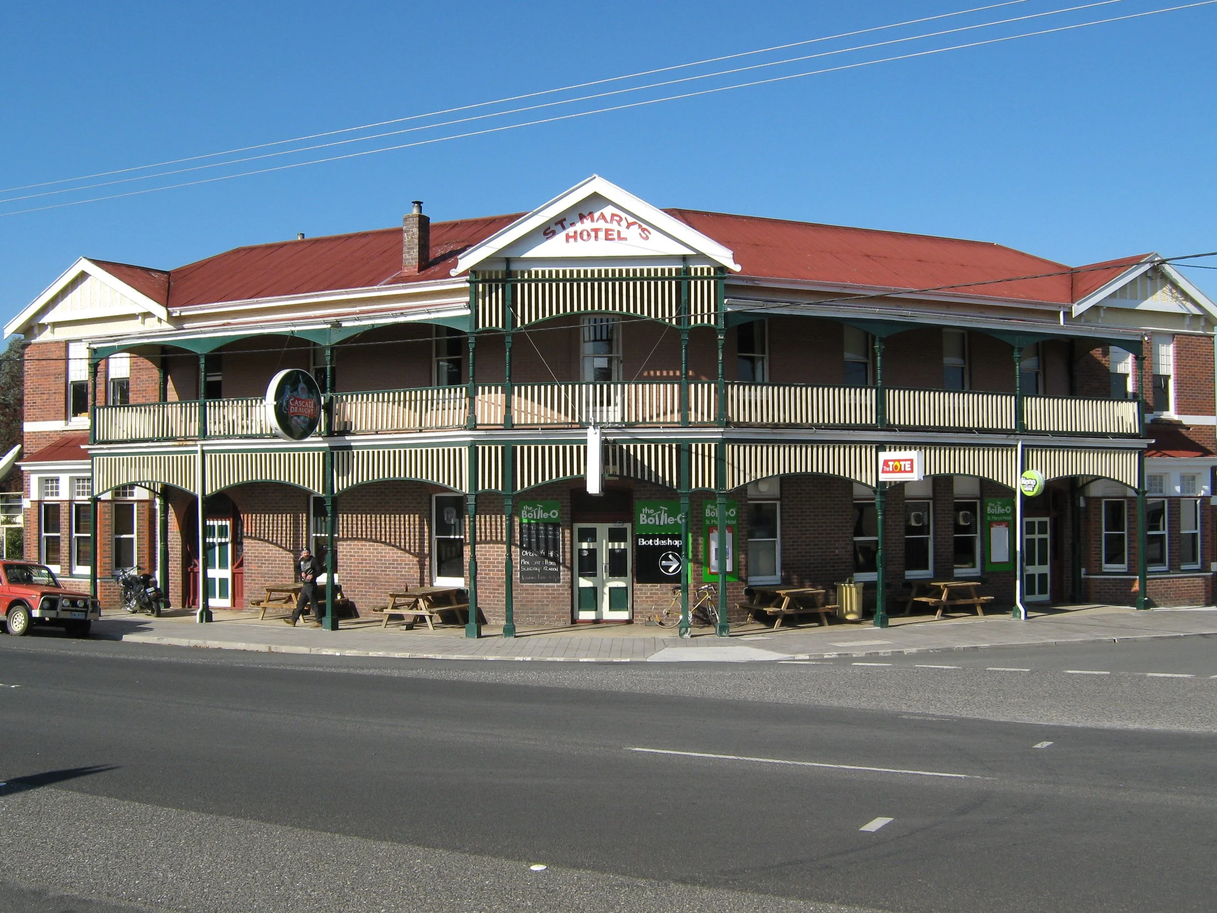 Slow paced relaxed township with friendly locals. Several coffee shops with great coffee, a bakery, takeaway Pizzas/Fish and Chips, Chinese food, the St Marys Hotel for an excellent, reasonably priced pub meal of enormous portions and the popular Purple Possum – health foods, gifts, bulk foods, and healthy tasty homemade meals.